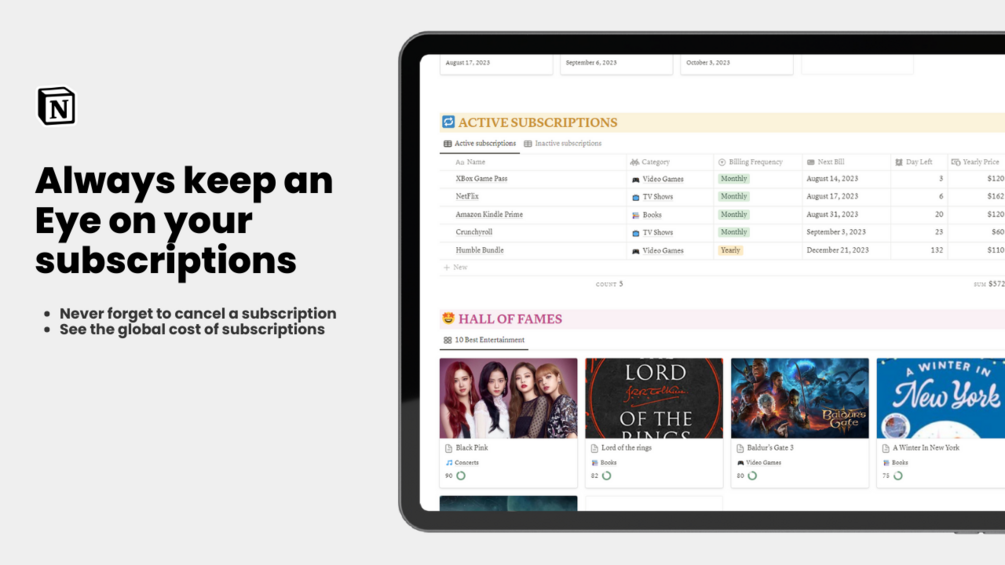 Ladies and gentlemen, the future of entertainment management is here. Our Notion template is your gateway to a seamlessly organized, hassle-free entertainment journey. Optimize your leisure time, stay on top of subscriptions, and revel in the joy of discovering new experiences—all at your fingertips. Join us on this exhilarating adventure as we reshape the way you savor entertainment. Thank you.