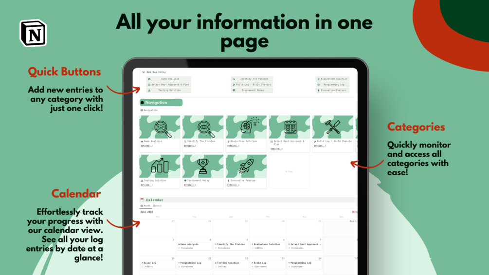π Prefilled Pages for Each Category: Never miss a beat with our comprehensive, prefilled pages tailored for every aspect of your robotics journey. From initial brainstorming and design sketches to final testing and competition logs, we've got you covered!